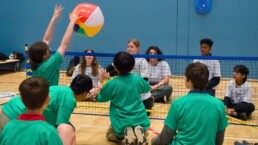 The year group was split into their two classes. St Teresa class, a lively bunch, thoroughly enjoyed all of sitting volleyball, boccia, goalball and new age kurling. If anything, they were so excited and enthusiastic, they took too long to listen to instructions and time slipped past and we missed out on sitting netball.