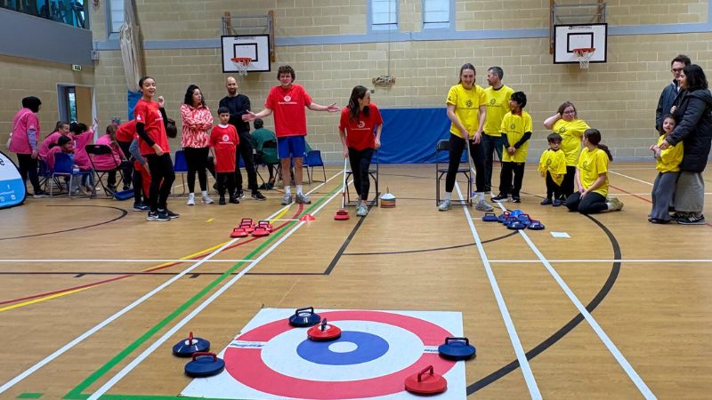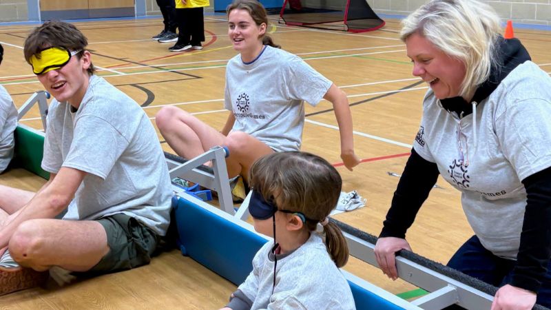 In addition to the 9 families from the Dwarf Sports Association, there were 26 Hawks and Ospreys, a couple of Castle School families and a few St Faith’s pupils to fly the home flag. Ten mixed teams of five or six players took on a carousel of inclusive sports. Each team, proudly sporting its own brightly coloured T‑shirts, moved between boccia, goalball, new age kurling, sitting volleyball, walking football and, to finish, a giant game of sitting netball.
