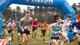 My first foray was in the forest – on Sunday 27th March – Thetford Forest to be precise, on trails through the woods. It had been an unseasonably warm Saturday, so the runners were delighted to wake up to cloud cover. As a spectator I was very glad for the warm coffee! Set in a clearing the start/finish was all so professional, with arch, registration tent and a sound system for the warm-up.